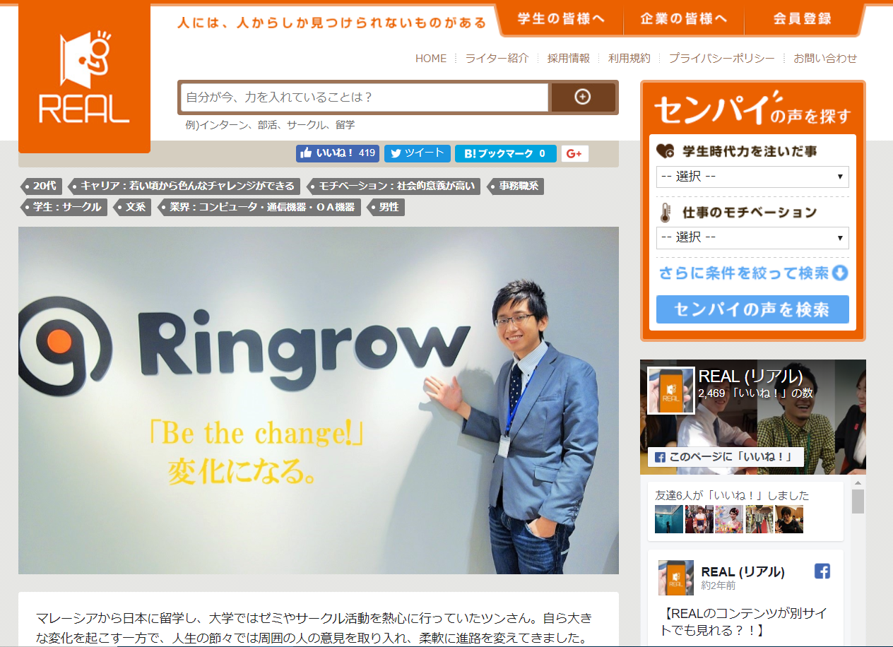「イチバン」を語れる企業と、「熱」を語れる学生が、「組織」ではなく「人」で繋がるキャリアデザインメディア・REALに人事課のツンの入社の経緯と仕事への想いのインタビューが掲載されました。