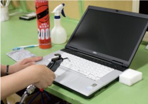 ▲クリーニング風景。キーボードの隙間に入り込んだごみや埃を吹き飛ばす工程。