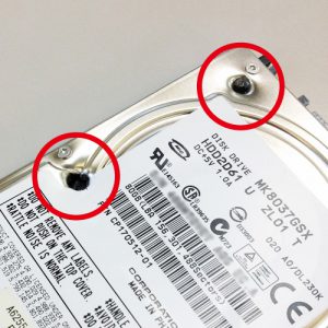 ▲ハードディスクに穴を開けて物理破壊し、データ消去を行う。専用ソフトを用いての作業も可能。