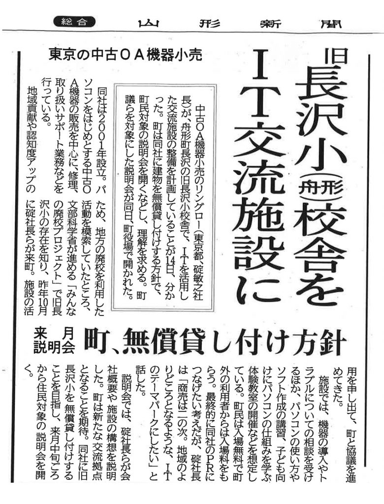 2016.01.15 Media 『山形新聞』に掲載されました! ツイート シェア 山形県舟形町での廃校利用プロジェクトについて掲載されました 山形県舟形町の旧長沢小学校をIT交流施設として再利用するリングロー独自の廃校利用プロジェクトについて、2016年1月15日付の山形新聞に掲載されました。 http://yamagata-np.jp/(山形新聞HP) 一覧へ戻る