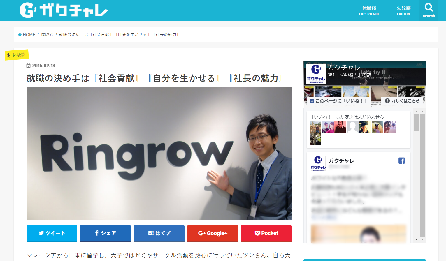 2016.02.18 Media 『ガクチャレ』に掲載されました! ツイート シェア 弊社社員が掲載されました 学生のやってみたいを応援する体験共有型メディア・ガクチャレに人事課のツンの仕事に対する想いのインタビューが掲載されました。 http://gakuchalle.com/ringrow/(掲載記事URL) 一覧へ戻る