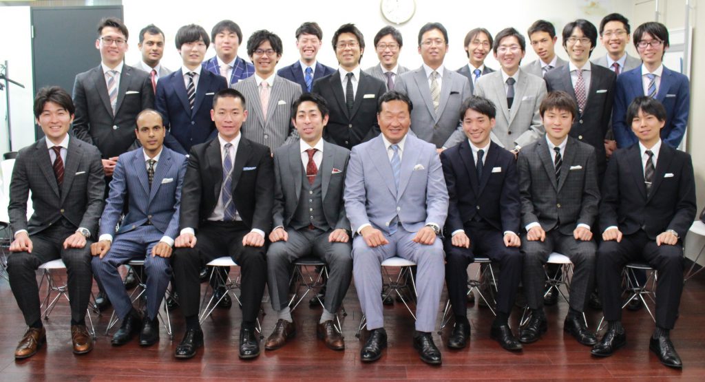 ▲4月16日に行われた全社報告会では全員がオーダースーツを着用。