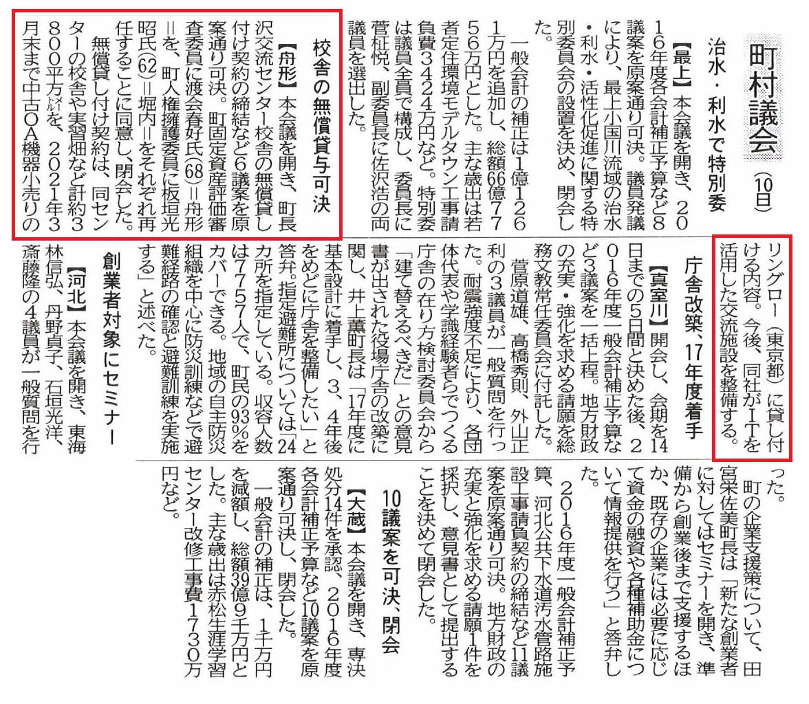 2016.06.11 Media 『山形新聞』に掲載されました! ツイート シェア 山形県舟形町議会での旧長沢小学校の無償貸与可決について掲載されました リングロー独自の廃校利用プロジェクトの第一弾として、山形県舟形町の旧長沢小学校の無償貸し付けが町議会で議決されたことについて、2016年6月11日付の山形新聞に掲載されました。 http://yamagata-np.jp/(山形新聞HP) 一覧へ戻る