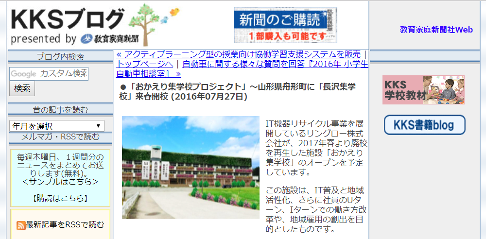 2016.07.27 Media 『KKSブログ』に掲載されました! ツイート シェア 「おかえり集学校プロジェクト」について掲載されました リングロー独自の廃校利用プロジェクト「おかえり集学校」について、2016年7月27日付でKKSブログ presented by 教育家庭新聞に掲載されました。 http://www.kknews.co.jp/wb/archives/2016/07/post_7721.html(KKSブログ presented by 教育家庭新聞・記事URL) 一覧へ戻る