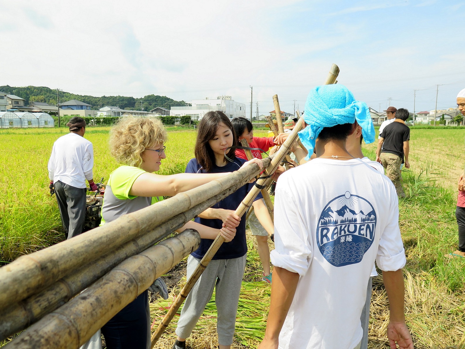 2016年9月17日に千葉県館山市にて実施された稲刈りワークショップに、リングローから新入社員や外国人社員を含む11名が研修として参加しました。同年4月31日に行われた田植えワークショップで植えた稲は、度重なる台風にも負けず元気に育っており、今回はその稲の稲刈りから脱穀までを一度に行いました。稲刈り機を使うだけでなく、鎌を使って自分の手で稲を刈る体験をし、脱穀の作業では、稲を天日干しする竹を自分たちで組み、束にした稲を干していきました。手間をかけて天日干しをするのは、米の水分量を15パーセントほどにし一年中保存ができる米にするためです。リングロー社員は田植えワークショップに3年連続で参加してきましたが、悪天候の影響があり稲刈りワークショップには今回が初参加となりました。リングローでは今後もこのような研修を実施し、社員が自然に触れる機会や、価値観の転換のきっかけを与える試みを続けていきます。