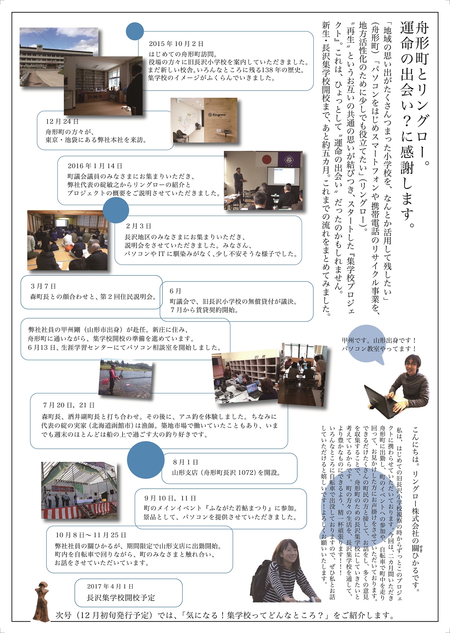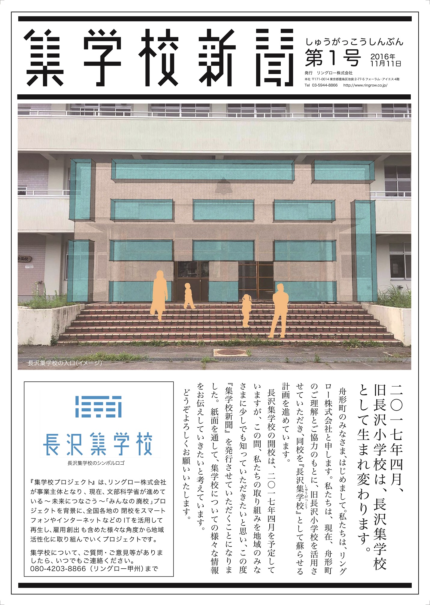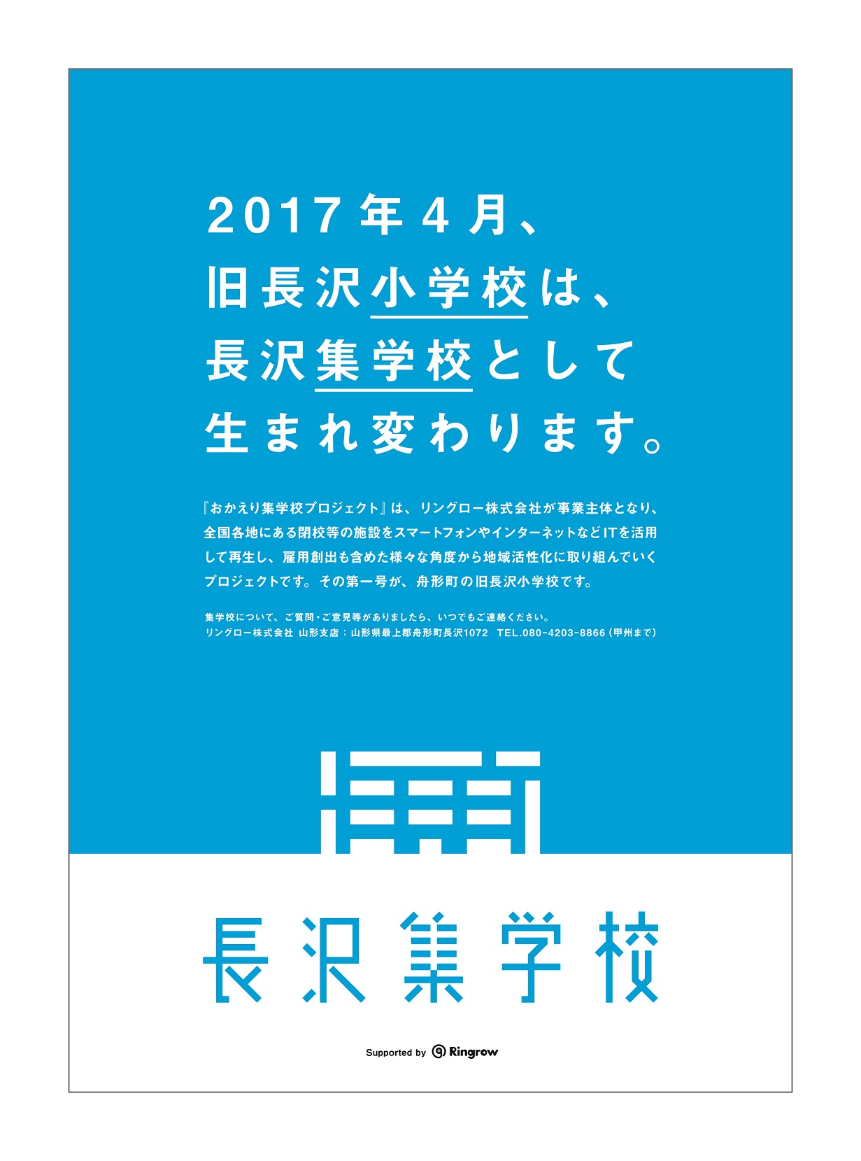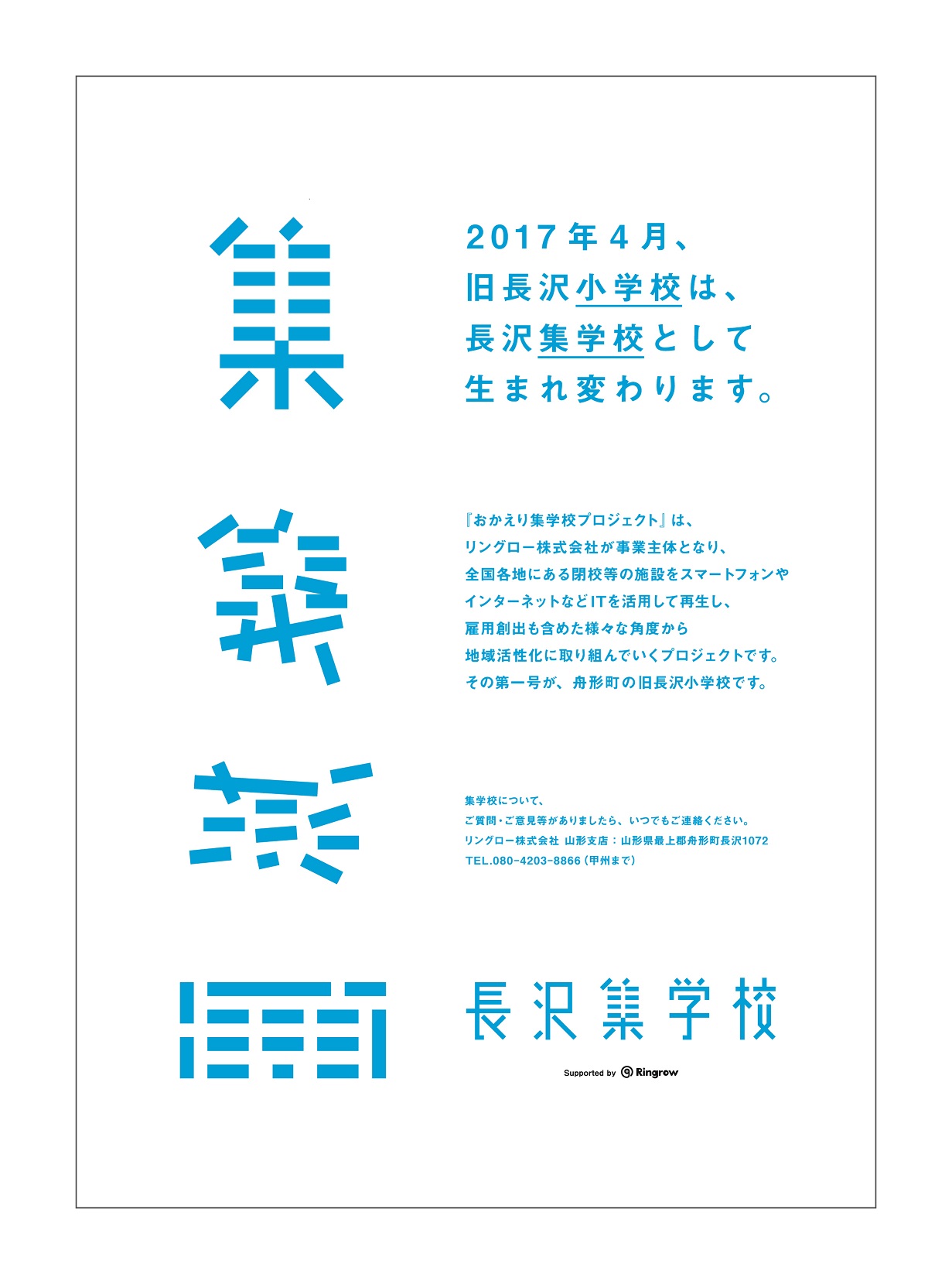 2016年12月15日より、「長沢集学校」公式ポスターを舟形町と周辺の市町村に掲示開始します。ポスターは集学校のシンボルロゴを印象的に扱い、舟形町の色である水色をベースとしたシンプルなデザインに仕上げました。同年11月11日には「集学校新聞」(A3両面カラー印刷)を発行し、町の広報誌と共に住民に配布。「集学校新聞」は第2号が12月9日に発行され、今後も4月の開校までの4か月間、月に一度のペースで発行予定です。内容は、住民を対象としたパソコン教室などのイベント情報や、長沢集学校で展開する具体的なコンテンツ、リングロー代表取締役・碇敏之の長沢集学校への熱い思いなどについて掲載していきます。今後、「おかえり集学校」についてFacebookでの情報発信も行っていく予定です。