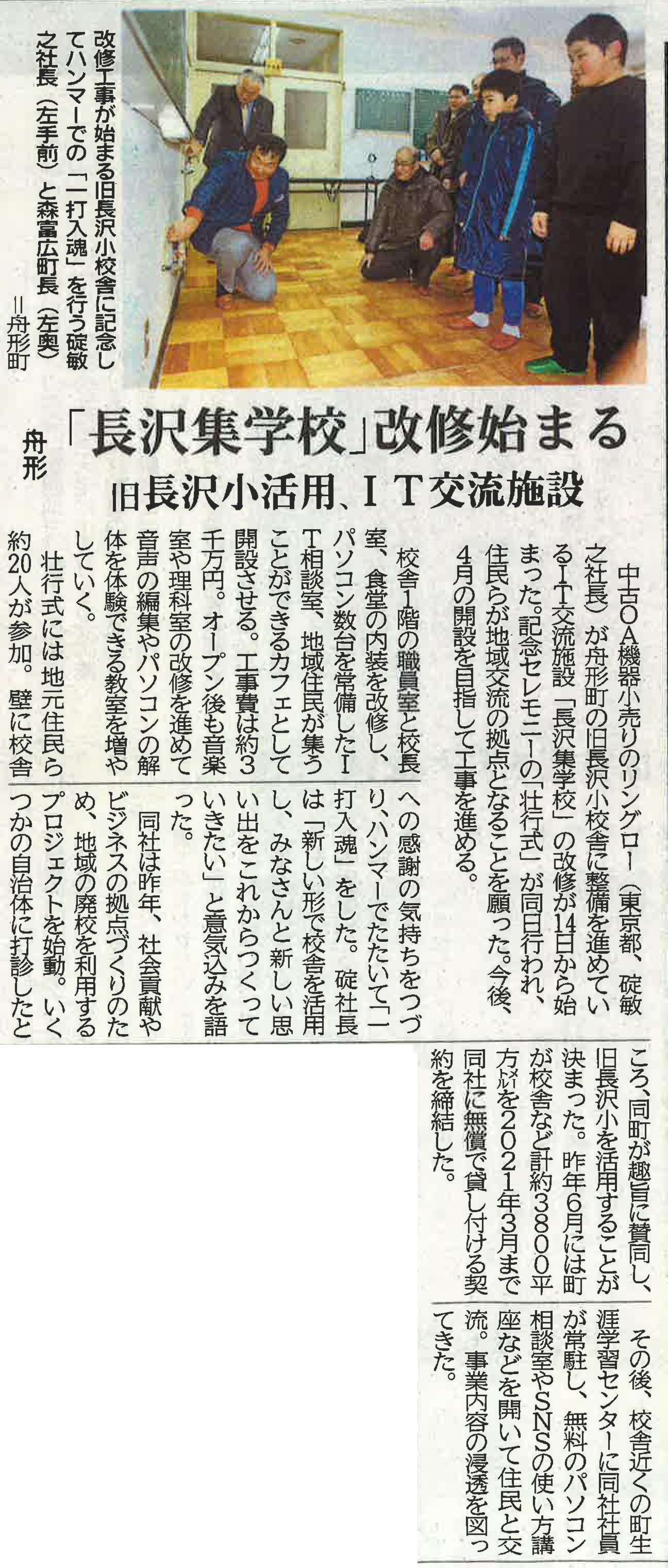 2017.01.15 Media 『山形新聞』に掲載されました! ツイート シェア 「旧長沢小学校壮行会」について掲載されました 山形県最上郡舟形町の廃校利用プロジェクト「長沢集学校」の改修工事開始イベントについて、2017年1月15日付で山形新聞に掲載されました。 http://yamagata-np.jp/news/201701/15/kj_2017011500339.php(山形新聞・記事URL) 一覧へ戻る