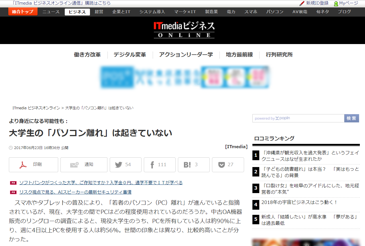 2017年6月8日~6月17日に279名の現役大学生を対象に実施した「イマドキ大学生のパソコンに関する意識調査」について、ITmediaビジネスONLiNEに掲載されました。