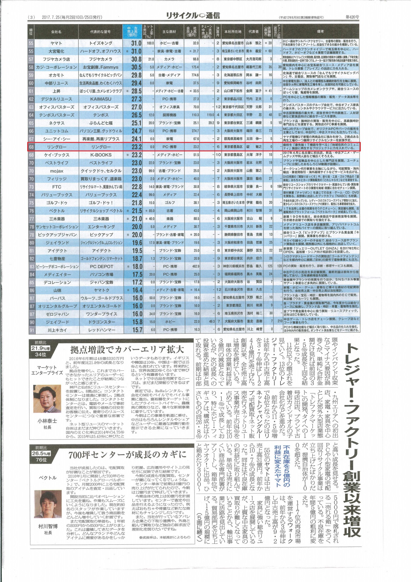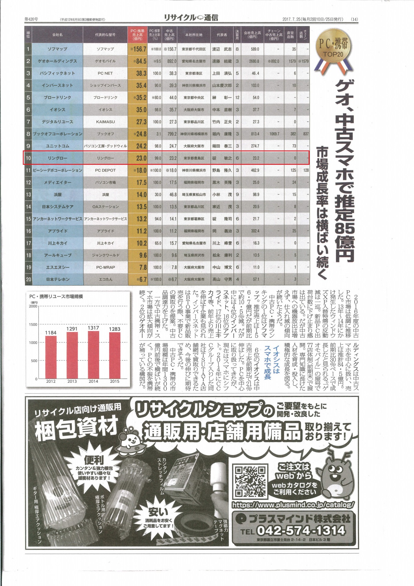 リングローが、2017年7月25日付のリサイクル通信の中古売上ランキングに掲載されました。