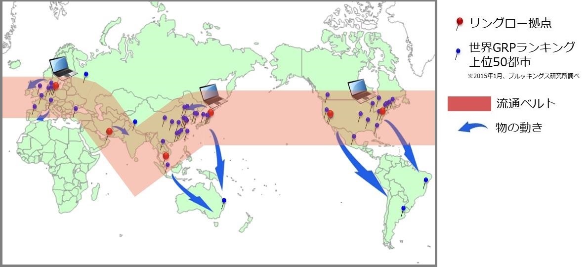 リングローの海外戦略は、2020年までに海外5拠点を開設し、日本を含む世界6拠点で横軸の流通ベルトを形成することです。各拠点は経済的に発展した商業都市に置きます。