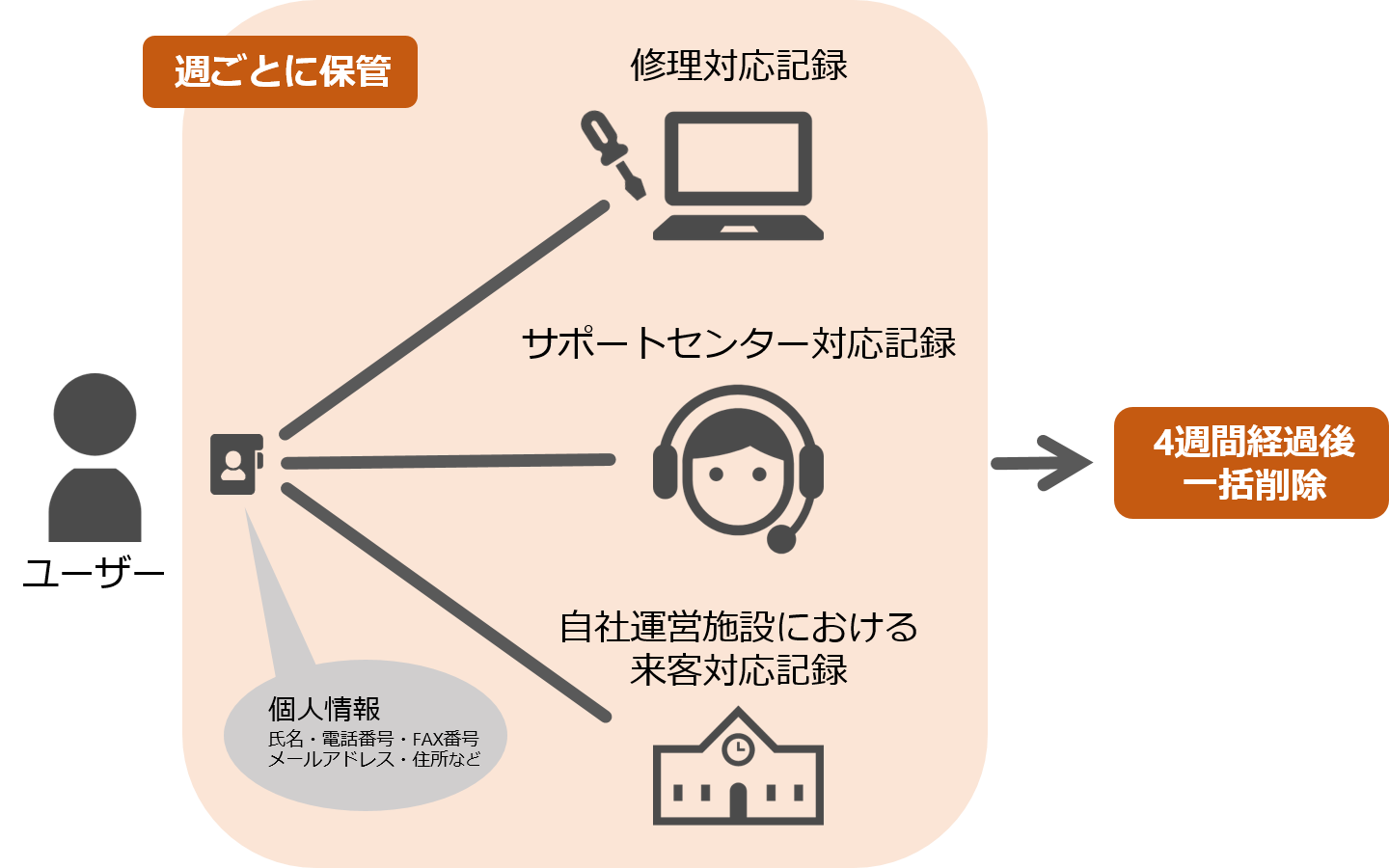 以下の個人情報を週ごとに管理し、取得から4週間経過ごとに一括で破棄します。