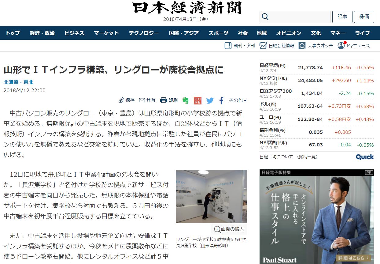 2018.04.12 Media 『日本経済新聞』に掲載されました! ツイート シェア 山形県・舟形町での新規事業について掲載されました リングローが運営する廃校活用施設「長沢集学校」にて実施したIT化事業計画説明会の内容が、2018年4月12日付で日本経済新聞電子版に掲載されました。 https://www.nikkei.com/article/DGXMZO29324980S8A410C1L01000/(記事URL) 一覧へ戻る