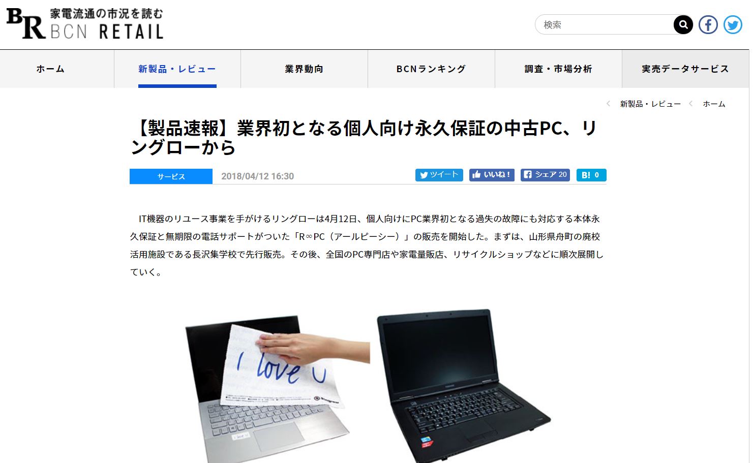 リングローが4月12日より販売開始した永久保証付き・過失でも保証・無期限の電話サポート付きの中古パソコンについて、BCN RETAILにて2018年4月12日付で掲載されました。