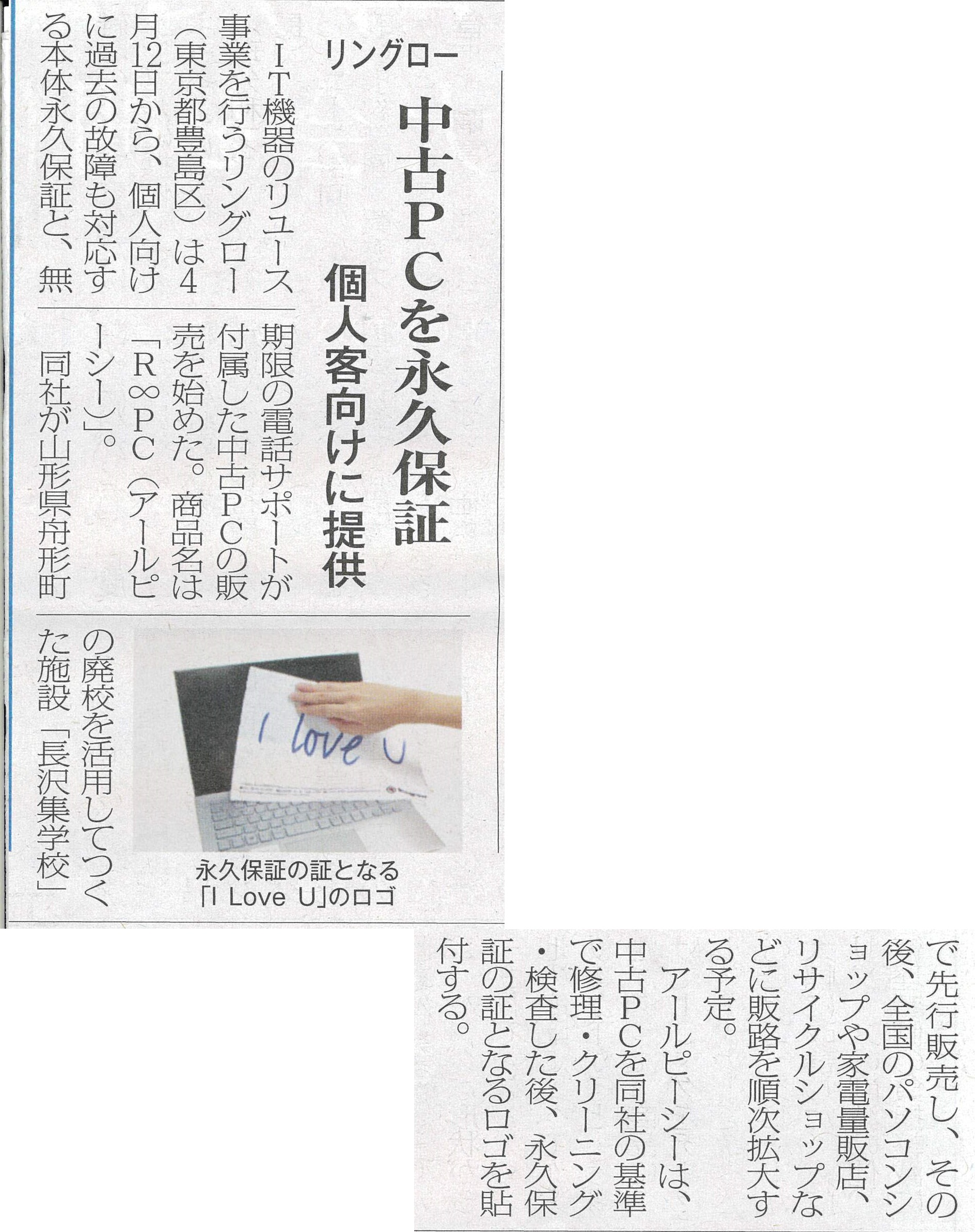 リングローが4月12日より販売開始した永久保証付き・過失でも保証・無期限の電話サポート付きの中古パソコンについて、リサイクル通信にて2018年5月10日付で掲載されました。
