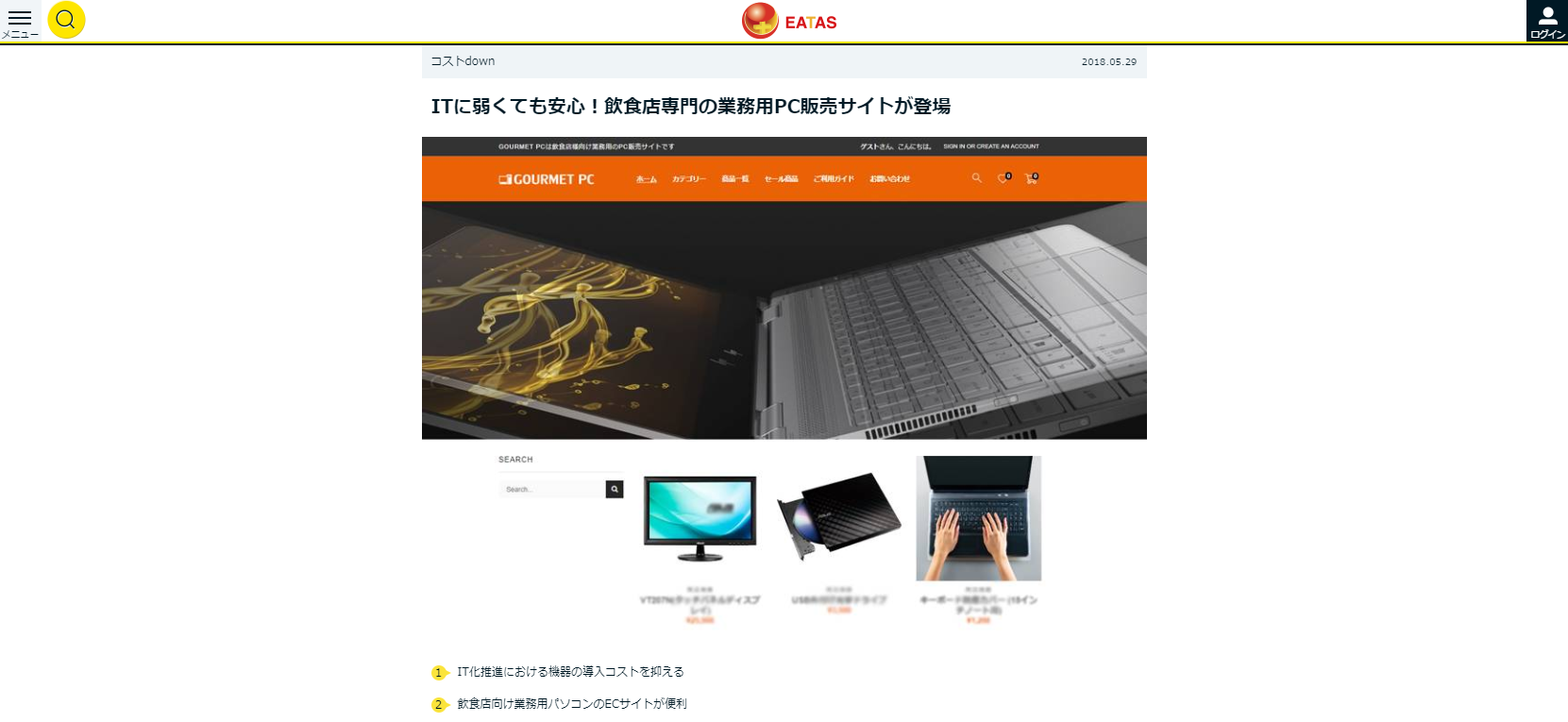 2018.05.29 Media 『EATAS』に掲載されました! ツイート シェア 飲食店向けECサイト「GOURMET PC」の開設について掲載されました 2018年5月29日付のEATASにて、飲食店向けECサイト「GOURMET PC」の開設について掲載されました。 https://eatas.jp/article/292(記事URL) 一覧へ戻る