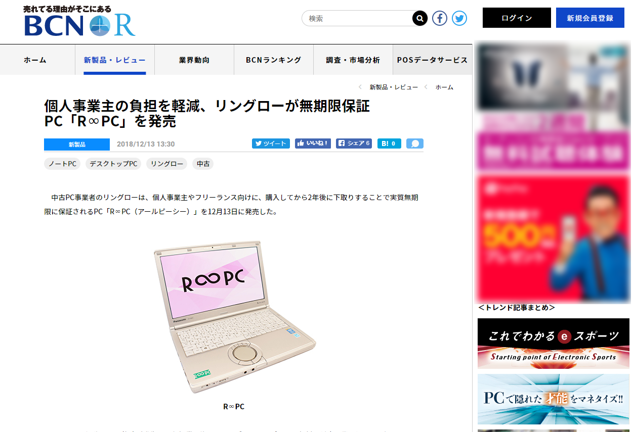 12月13日に販売を開始した個人事業向け無期限保証パソコン「R∞PC」が、2018年12月13日付でBCN RETAILに掲載されました。