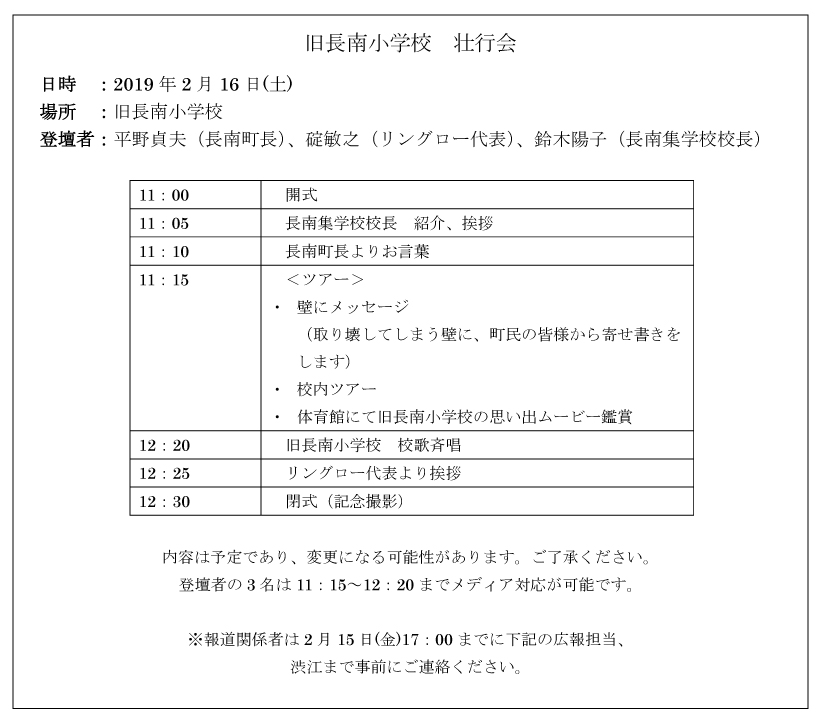 長南町民の方々と一緒に、「長南集学校」へ生まれ変わる旧長南小学校を送り出す壮行会を2月16日(土)に開催します。(主催:リングロー)
