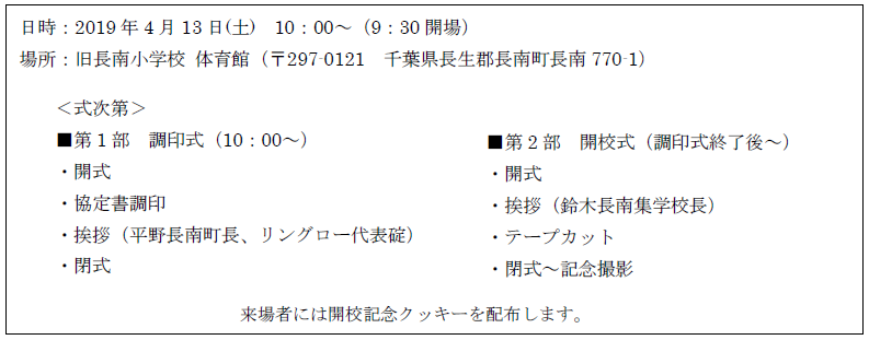 このたび「長南集学校」開校を記念して、下記の通り平野貞夫町長と碇敏之リングロー代表による協定書の調印式・開校式、オープニングイベントを行います。調印式・開校式終了後には、現役YouTuberを招いてSNSや動画投稿などインターネットの正しい利用に関するトークイベントも開催します。
