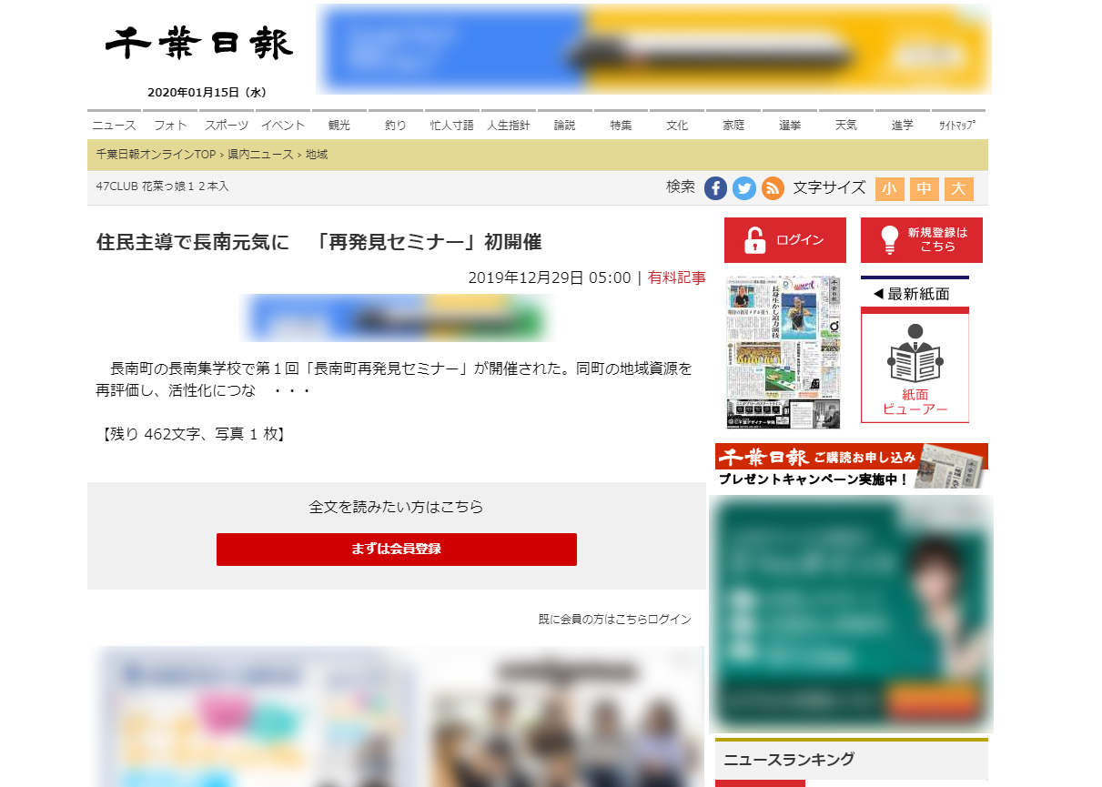 2019.12.29 Media 『千葉日報』に掲載されました! ツイート シェア 長南集学校で開催されたセミナーについて掲載されました 千葉県長生郡の長南集学校にて開催された「再発見セミナー」について、2019年12月29日付の千葉日報に掲載されました。 https://www.chibanippo.co.jp/news/local/656193(記事URL) 一覧へ戻る