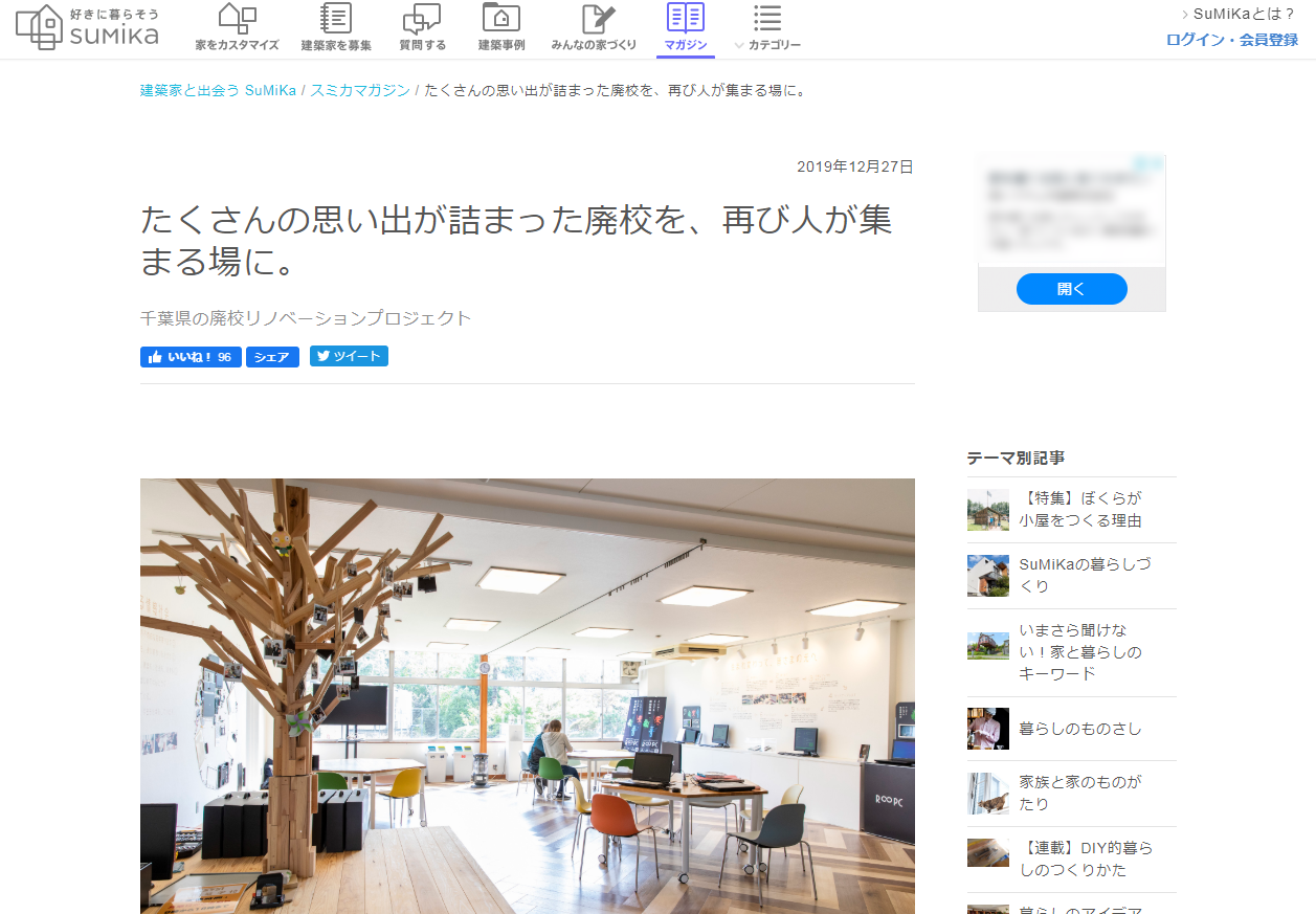 2020.01.08 Media 『スミカマガジン』に掲載されました! ツイート シェア 長南集学校の廃校リノベーションについて掲載されました 千葉県内の廃校リノベーションの事例として、長生郡長南町の長南集学校が2019年12月27日公開の『スミカマガジン』に掲載されました。 https://sumika.me/contents/13709(記事URL) 一覧へ戻る