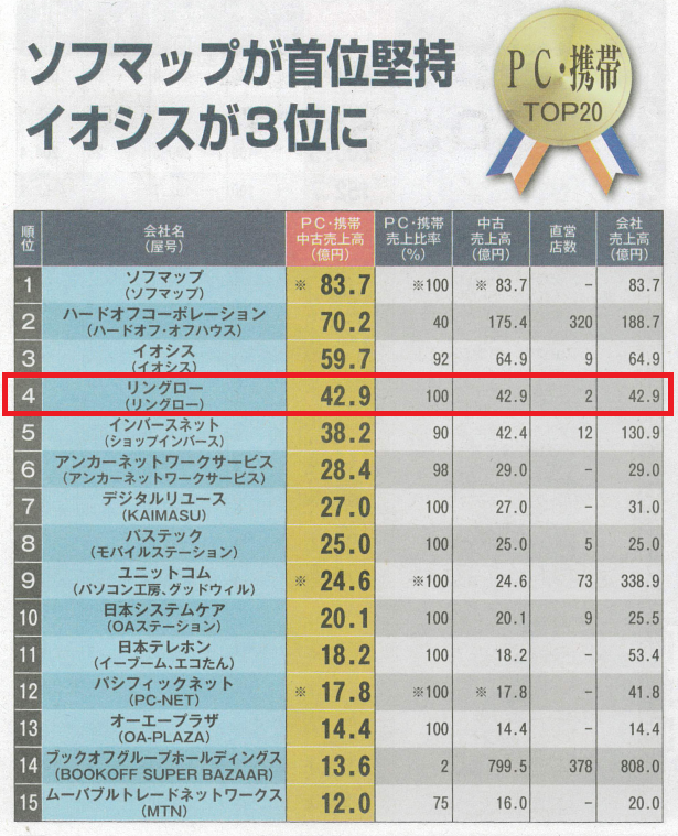 2020.01.28 Media 『リサイクル通信』2019年中古売上ランキング(PC・携帯部門)に掲載されました! ツイート シェア 中古売上ランキングのPC・携帯部門にて4位にランクイン リングローが、2020年1月25日付のリサイクル通信の2019年中古売上ランキングに掲載されました。 ▼PC・携帯部門で4位にランクインしました。 http://www.recycle-tsushin.com/(リサイクル通信HP) 全体のランキングはこちら! 昨年度の結果はこちら! 一覧へ戻る