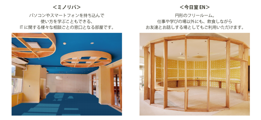 集学校内には自由に使えるWi-Fi環境を設備しています。また、「教育」をコンセプトとした本校には、プログラミング教室を行う『まなぶ室』、パソコンやスマートフォンなどのIT機器の無料相談ができる『ミノリバ』、コワーキング・学習・作業スペースとして幅広い利用ができる『今日室 EN(きょうしつ えん)』などをご用意しています。 ※現在改修工事中につき、以下、途中経過の写真となります。