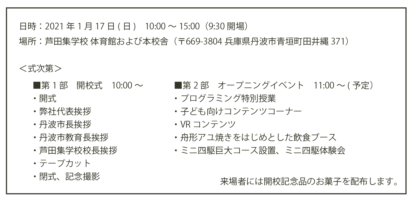 このたび「芦田集学校(あしだしゅうがっこう)」開校を記念して、下記の通り開校式及びオープニングイベントを行います。開校式では弊社代表、丹波市長、丹波市教育長、芦田集学校校長が登壇します。オープニングイベントでは、プログラミング特別授業や、舟形アユ焼きなどをはじめとした飲食ブース、射的・輪投げ・お菓子釣りなど子ども向けコンテンツなどを実施します。