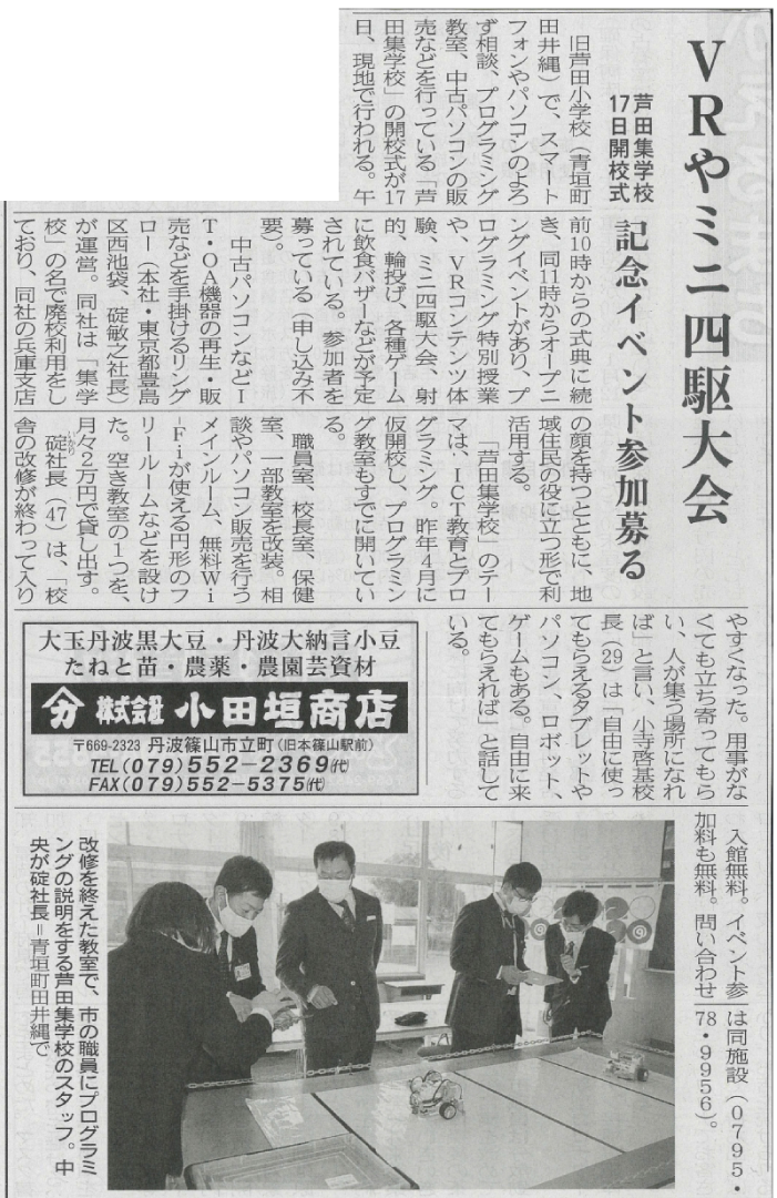 2021.01.17 Media 『丹波新聞』に掲載されました! ツイート シェア 芦田集学校について掲載されました 兵庫県丹波市の芦田集学校(旧芦田小学校)の開校式について、2021年1月17日付の丹波新聞に掲載されました。 https://tanba.jp/(丹波新聞HP) 一覧へ戻る
