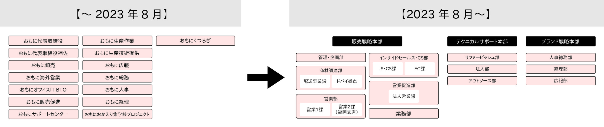2023年8月に組織体制の大幅なリニューアルを行いました。これまでは「自身の受け持つ担当部署に業務範囲を制限せず、一人ひとりが全ての業務に対して主体性を持ってほしい」という想いを込め”おもに〇〇”という部署名を採用していましたが、この度の見直しで部署を3分割した本部制に整え、今後は決裁権を持つ本部長を中心とした運営を促進していく形となります。再編成には部署の整理のほか、従業員の役割を明確にし、事業をより円滑にする狙いもあります。