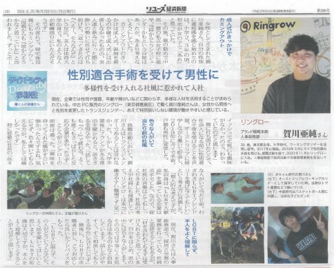 2024.06.27 Media 『リユース経済新聞』に掲載されました! ツイート シェア 人事部の賀川について掲載されました 人事総務部の賀川がリングローに入社するまでの経緯に関するインタビュー記事が、2024年6月25日付のリユース経済新聞に掲載されました。 https://www.recycle-tsushin.com/news/detail_9783.php(リユース経済新聞HP) 一覧へ戻る