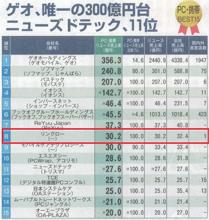 2024.08.12 Media 『リユース経済新聞』中古売上ランキング(2024年)のPC・携帯部門に掲載されました! ツイート シェア 中古売上ランキングのPC・携帯部門にて8位にランクイン リングローが、2024年8月10日付のリサイクル通信の中古売上ランキング(2024年)のPC・携帯部門に掲載されました。 ▼PC・携帯部門で8位にランクインしました。 http://www.recycle-tsushin.com/(リユース経済新聞HP) 全体のランキングはこちら! 前回の結果はこちら! 一覧へ戻る