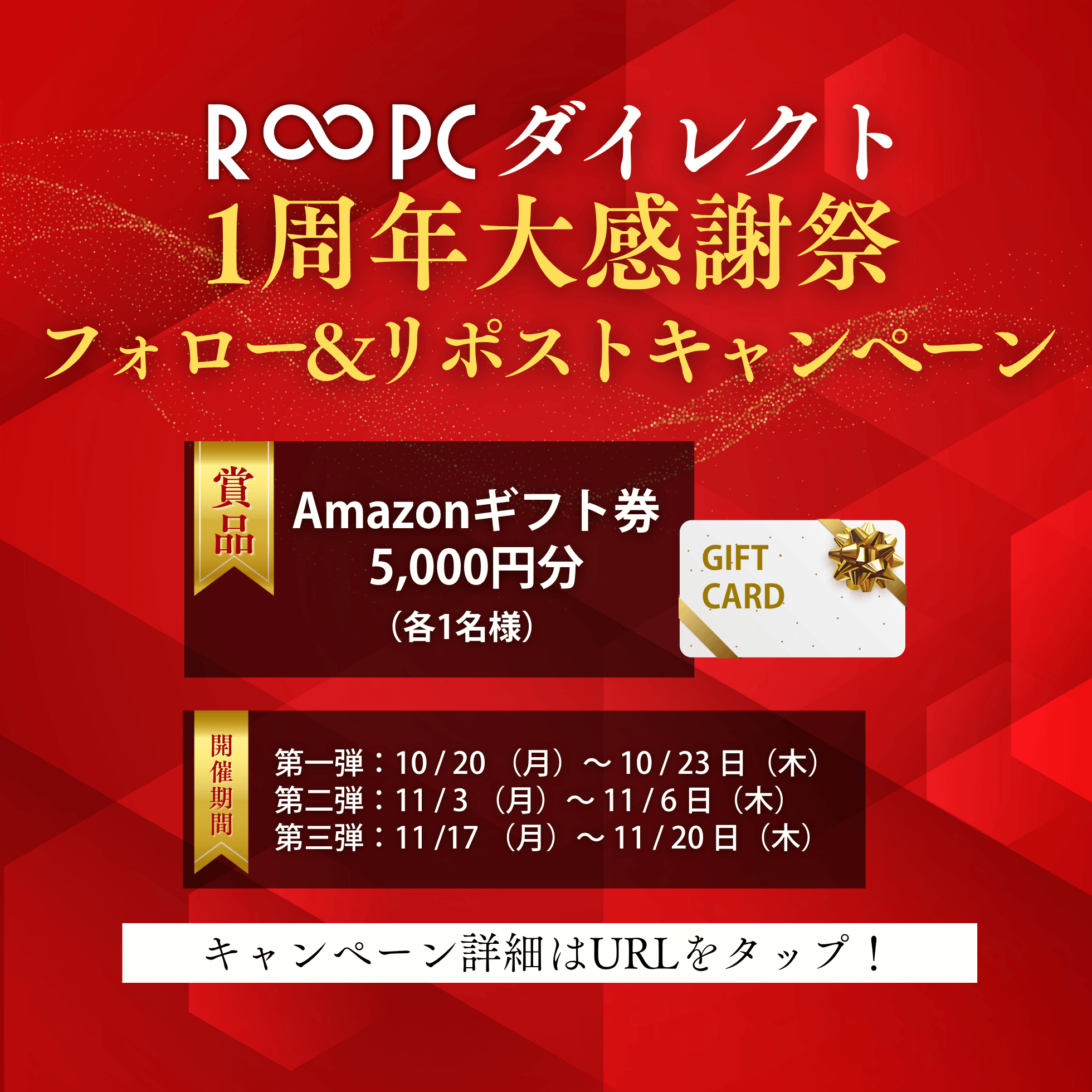 これまでのご愛顧に感謝し、2025年10月1日(水)~11月24日(月)の期間限定で「R∞PCダイレクト1周年大感謝祭」を開催中です。本キャンペーンをさらに盛り上げるため、公式X(旧Twitter)ではフォロー&リポストキャンペーンを開催。各回ごとにご参加いただいた方の中から、抽選で1名様にAmazonギフト券5,000円分をプレゼントします。