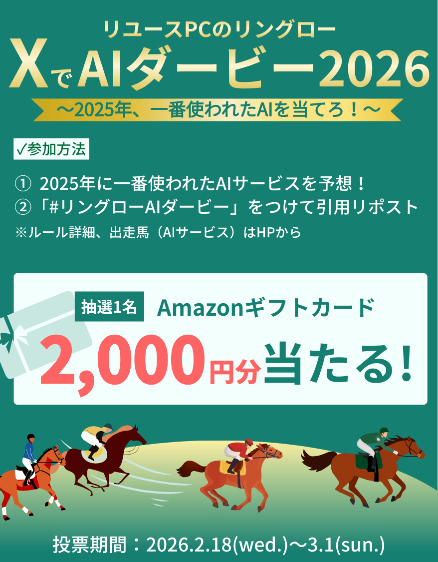 リユースPCのリングロー公式LINEでは2025年に最も使われたAIサービスを投票して決める「AIダービー2026」を開催中。
