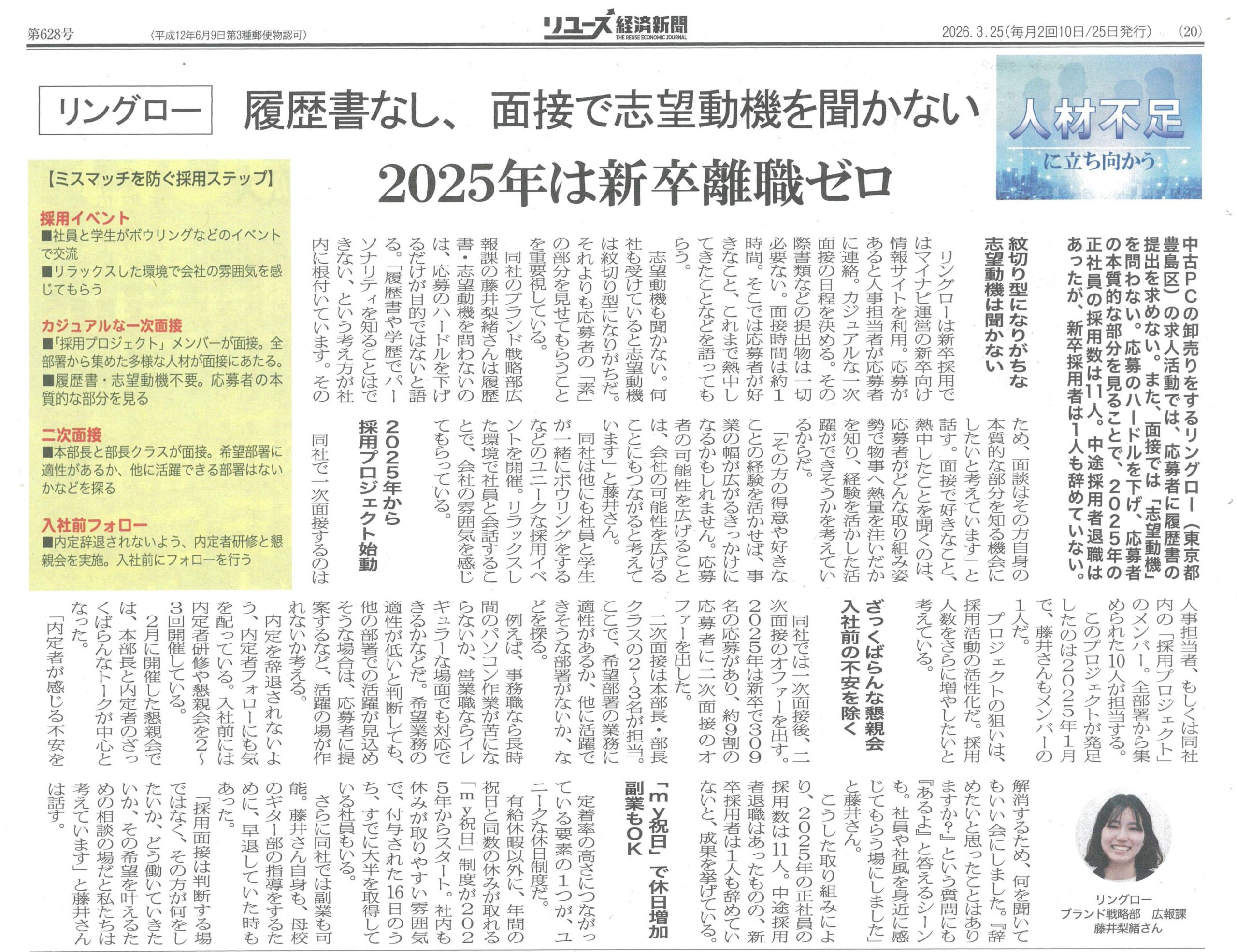 2026.04.02 Media 『リユース経済新聞』に掲載されました! ツイート シェア 『人材不足に立ち向かう』のコーナーにリングローが掲載されました 2026年3月25日付のリユース経済新聞の『人材不足に立ち向かう』のコーナーにリングローが掲載されました。 https://www.recycle-tsushin.com/news/detail_11538.php (リユース経済新聞HP) 一覧へ戻る