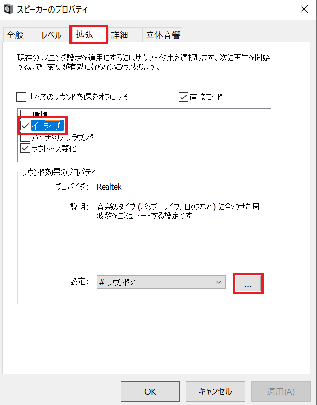 ④ 「拡張」タブを開き、「イコライザ」にチェックを入れ、「…」をクリック