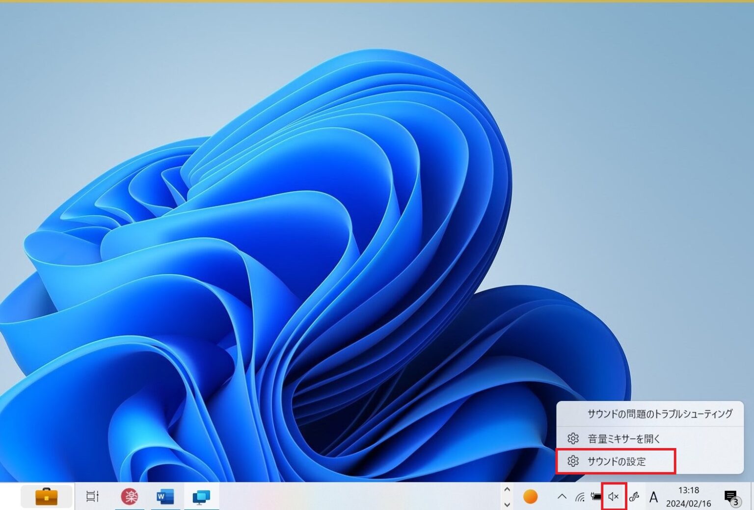 ① タスクバーのスピーカーアイコンを右クリックし、「サウンドの設定」を開く